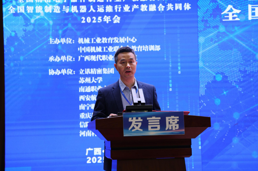 会上,广西现代职业技术学院校长黄绍光致欢迎词,对参会嘉宾表示热烈欢迎并介绍了当地产教融合发展概况。南通职业大学戴世明教授、殷朝华教授分别作2025年度共同体年会工作报告,全面总结共同体年度工作成效,部署下一阶段重点任务。大会主旨报告环节由西安航空学院机械工程学院院长王永锋主持。