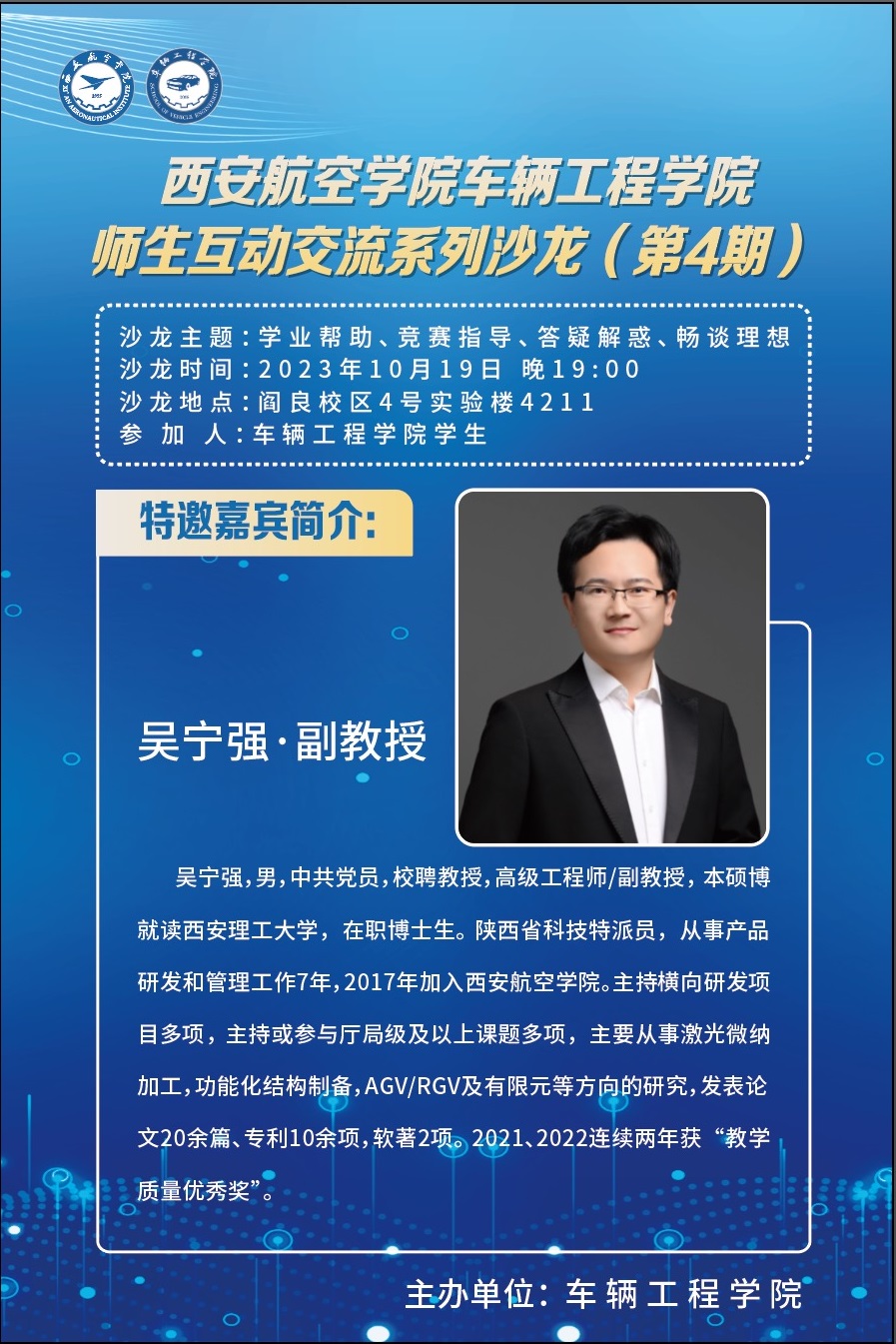 10月19日晚,车辆工程学院在阎良校区四号实验楼4211教室开展了“师生互动交流系列沙龙(第4期)”活动,专任教师吴宁强担任主讲人,学院五十余名学生参与此次活动。