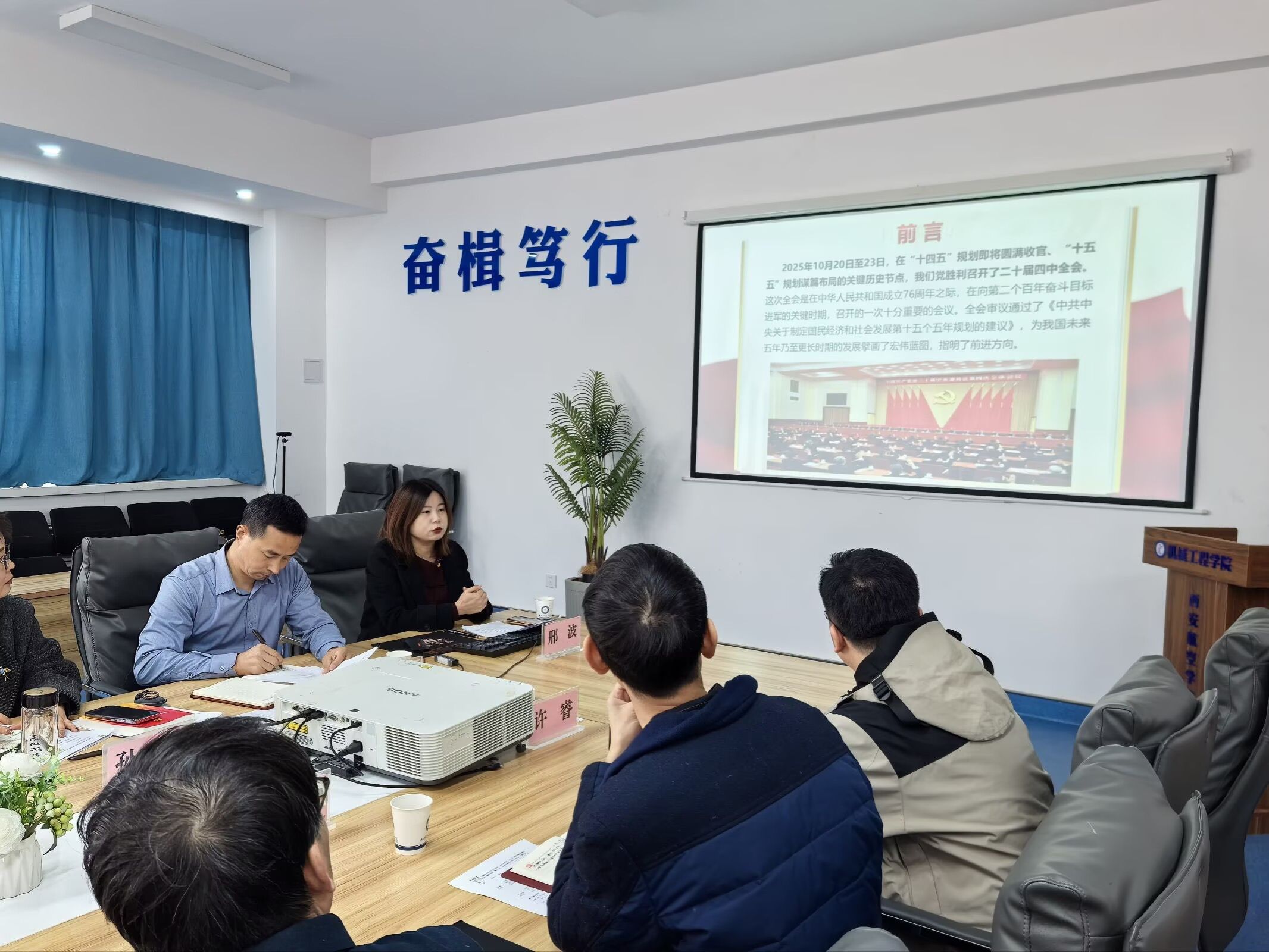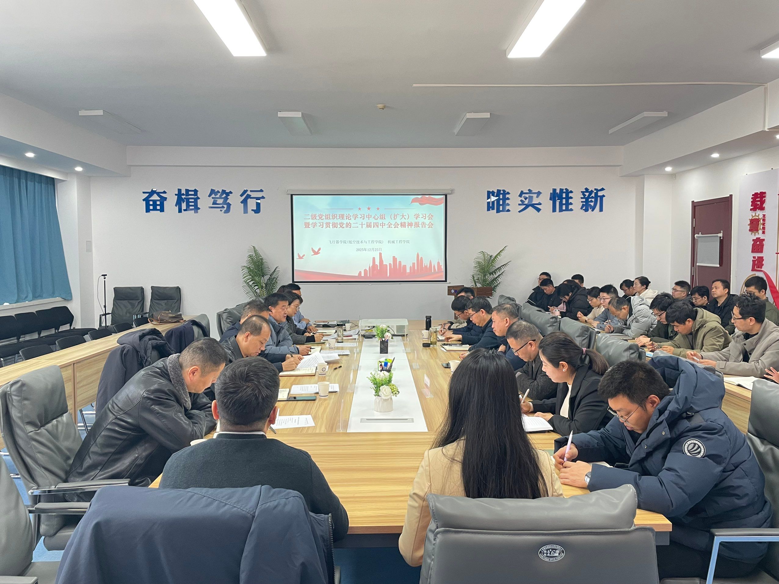 12月25日上午,机械工程学院与飞行器学院(低空技术与工程学院)在阎良校区3314会议室联合举行理论中心组(扩大)学习研讨会,围绕“深入学习贯彻党的二十届四中全会精神”开展专题学习。学校党委副书记、校长蒲永平出席并讲话,党委巡查办主任、党政办公室副主任张永成到会指导。马克思主义学院邢波教授作专题宣讲,两个学院领导班子成员、理论中心组成员、专业负责人、教研室主任及近三年新入职博士教师参加了学习。