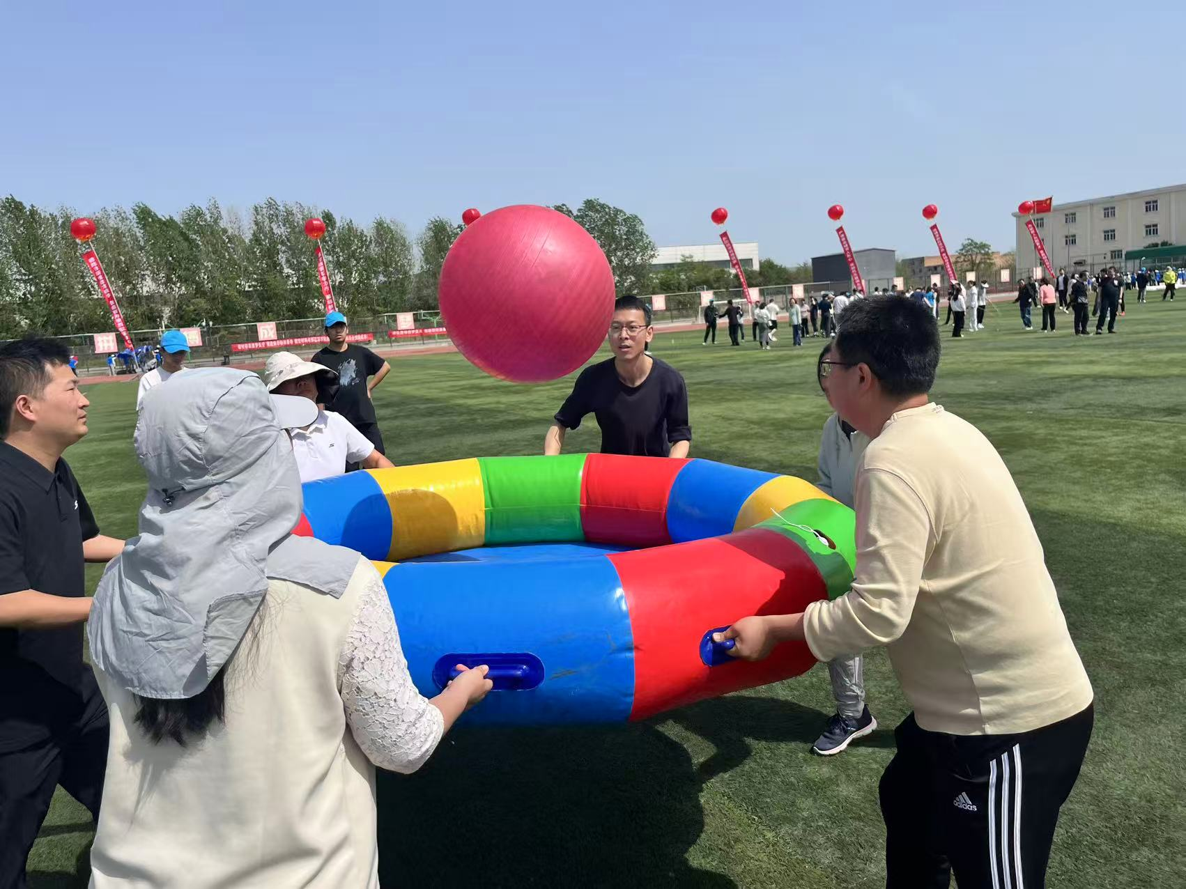 开幕式后,首先开始的是教职工个人项目。男女定点投篮,随着手腕轻抖,篮球便在空中划出一道从容的弧线,最终稳稳地落入篮网;立定跳远,教师运动员助跑、起跳、落地,在空中划出优美弧线,奋力奔赴更远目标;背抛实心球,选手蓄力、投掷,力量与技巧完美融合,展现着磅礴力量。教师们参加的集体项目同样精彩纷呈,跳绳接力、一锤定音、众星捧月、航天飞机,4×100混合接力赛中,小小接力棒传递的是信任与团结,承载的是梦想与希望。一棒接一棒的传递,一步接一步的冲刺,凝聚起团队的磅礴力量,诠释着同心协力、奋勇争先的团队精神,进一步将赛场氛围推向高潮。