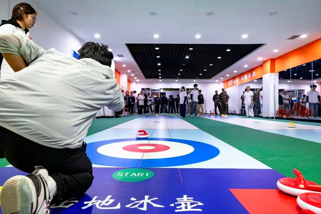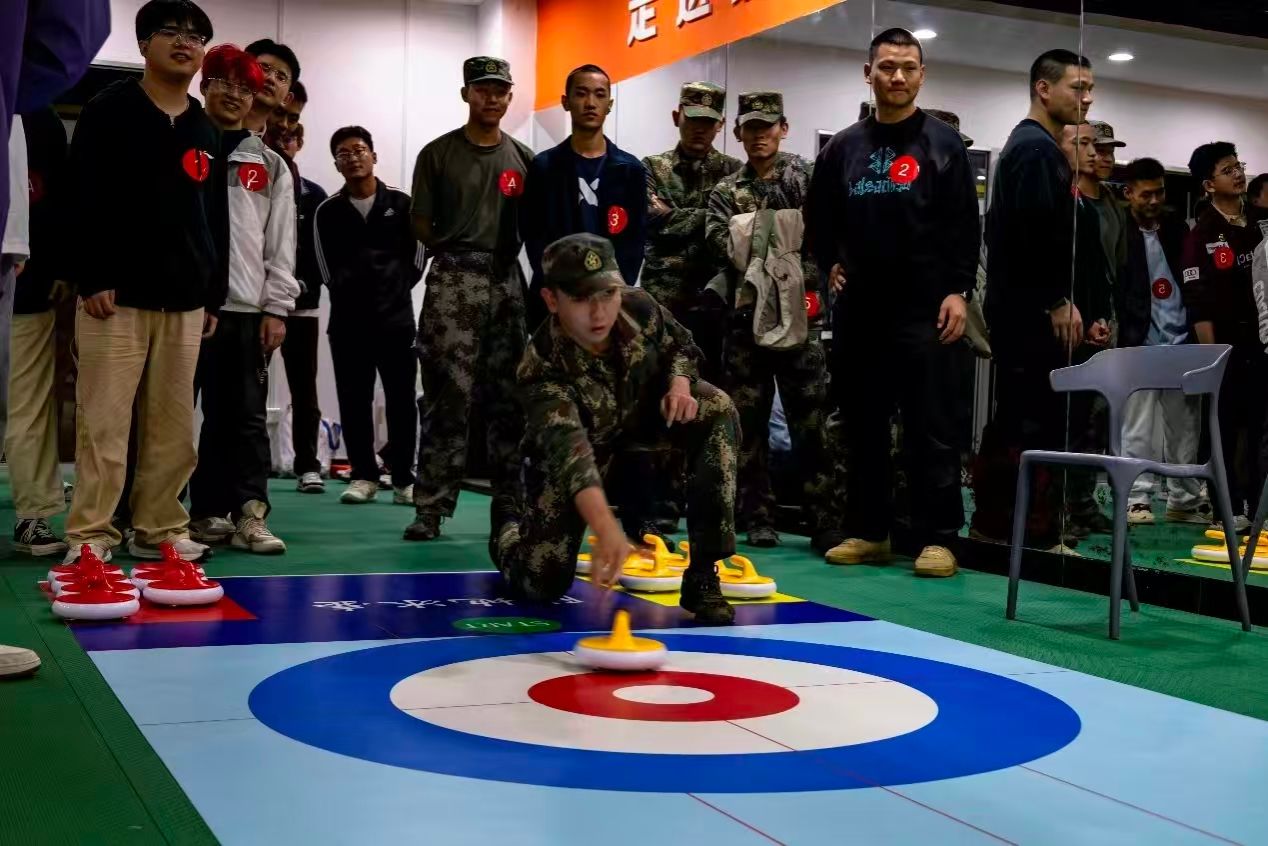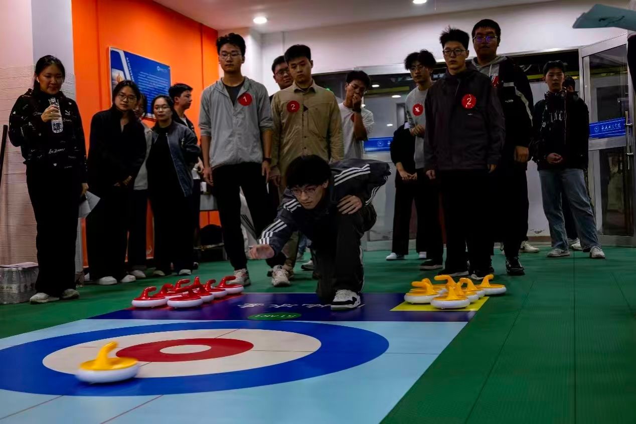 七秩弦歌庆华诞,赛场逐梦展风采!在学校七十周年校庆的热烈氛围里,迎校庆·首届“立讯精密杯”大学生陆地冰壶比赛重磅来袭!同学们在一餐厅负一楼陆地冰壶场地同台竞技,为校庆增添了一抹灵动又热血的色彩。为丰富学校体育文化生活,增强学生身体素质与团队协作精神,10月13日下午七点,全校各级学院男子组预赛在一餐厅陆地冰壶场开赛。