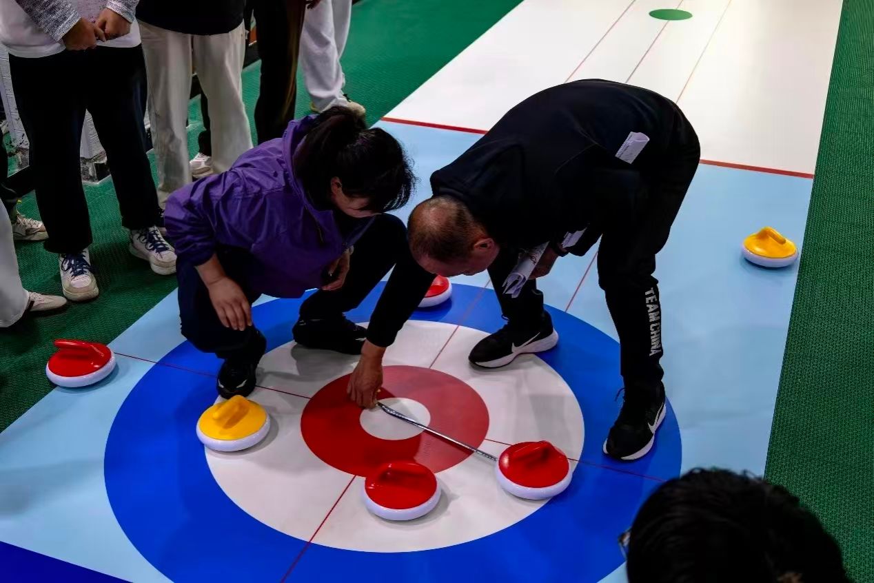 随着比赛深入,选手们开始熟练运用“占位”“撞击”等基础战术。在机械工程学院队伍和飞行器学院队伍扣人心弦的对决中,双方你来我往,比分紧咬,对待比赛都十分谨慎。飞行器院队精准定位,将冰壶滑入外圈给机械院队设下障碍,谁想机械院队掷出的冰壶从斜侧杀出,划出一道白色的弧线,在“砰”的一声后,将对手的壁垒请出界外,为己方开出全新局面。这声轻响如玉磐轻击,在赛场回荡,激起观看者一阵惊叹,随后化作浪潮般的掌声。