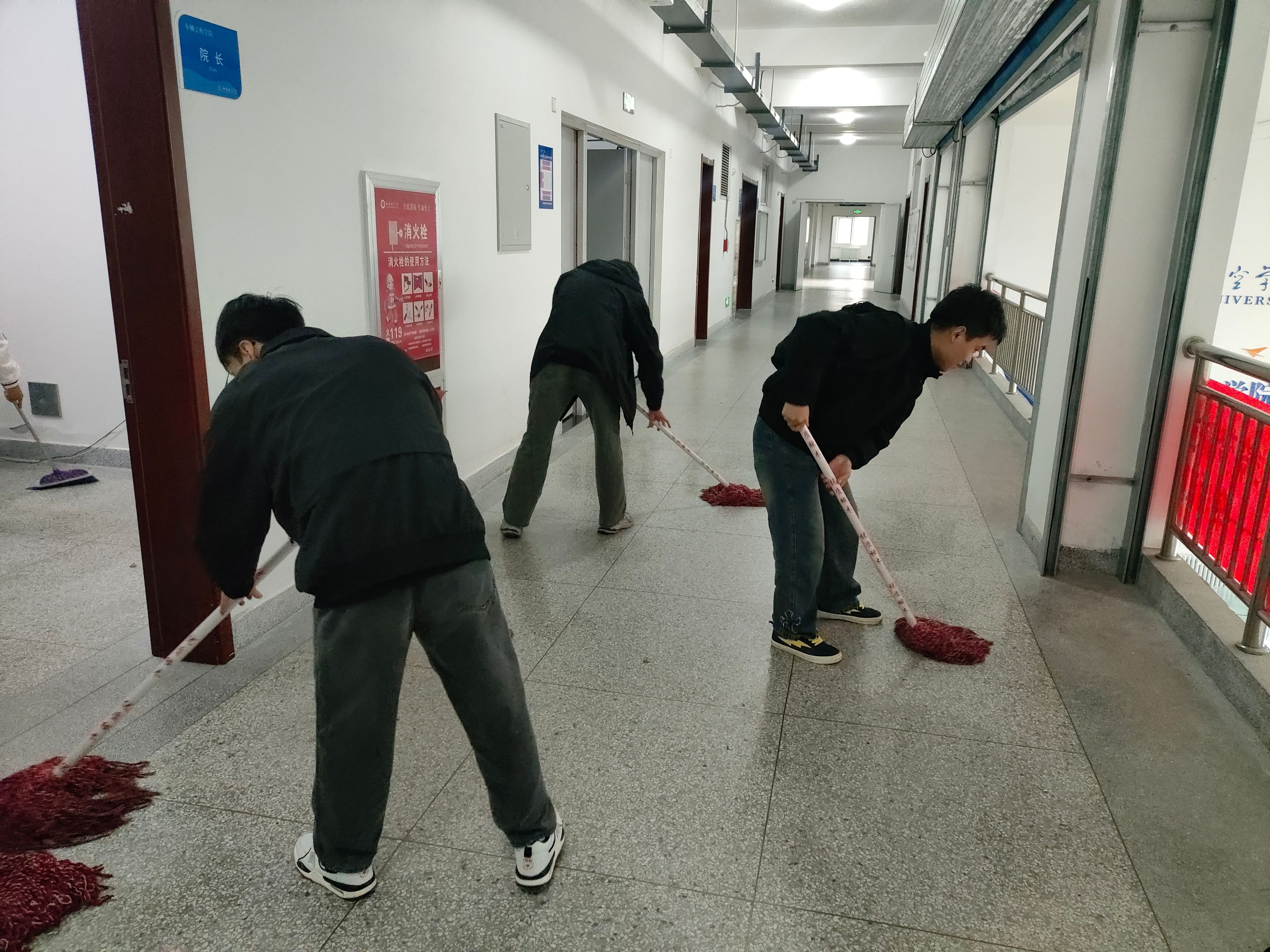 学院将学生分为若干小组,明确各小组负责区域与任务:教学区小组重点对四号实验楼北侧,学院实训中心、实验室及周边公共区域进行清扫,广大学生擦拭门窗玻璃、课桌椅、讲台及教学设备,清理地面杂物与卫生死角;对学生宿舍、宿舍楼道、责任教室带等区域进行打扫。大家分工明确、协作有序,用双手为校园环境“焕新颜”,切实体会“劳动最光荣”的深刻内涵。