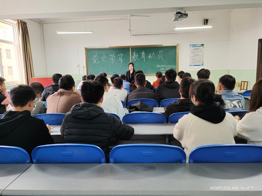 为了深入贯彻落实《中共中央关于在全党开展党史学习教育的通知》及省、市、校党史教育动员大会精神,3月26日下午车辆工程学院学生党支部在北楼333,开展了向建党一百周年献礼之党史学习教育动员大会暨书记讲党课活动,由学生第一党支部书记金雪主持,全体学生党员参加。
