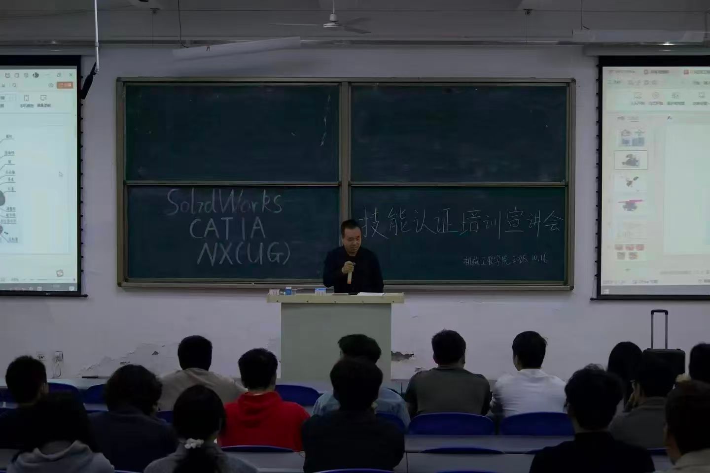 为加强学风建设、提升学生专业技能水平、促进高质量就业,10月16日,机械工程学院特邀西安亿信中久电子信息技术有限公司总经理陈阳及学院图学会带头人张孝林老师在阶梯教室开展了SW/ NX(UG)/CATIA技能认证培训宣讲会。学院副院长李懿、副书记刘欣和对技能认证感兴趣的同学参与了宣讲会。
