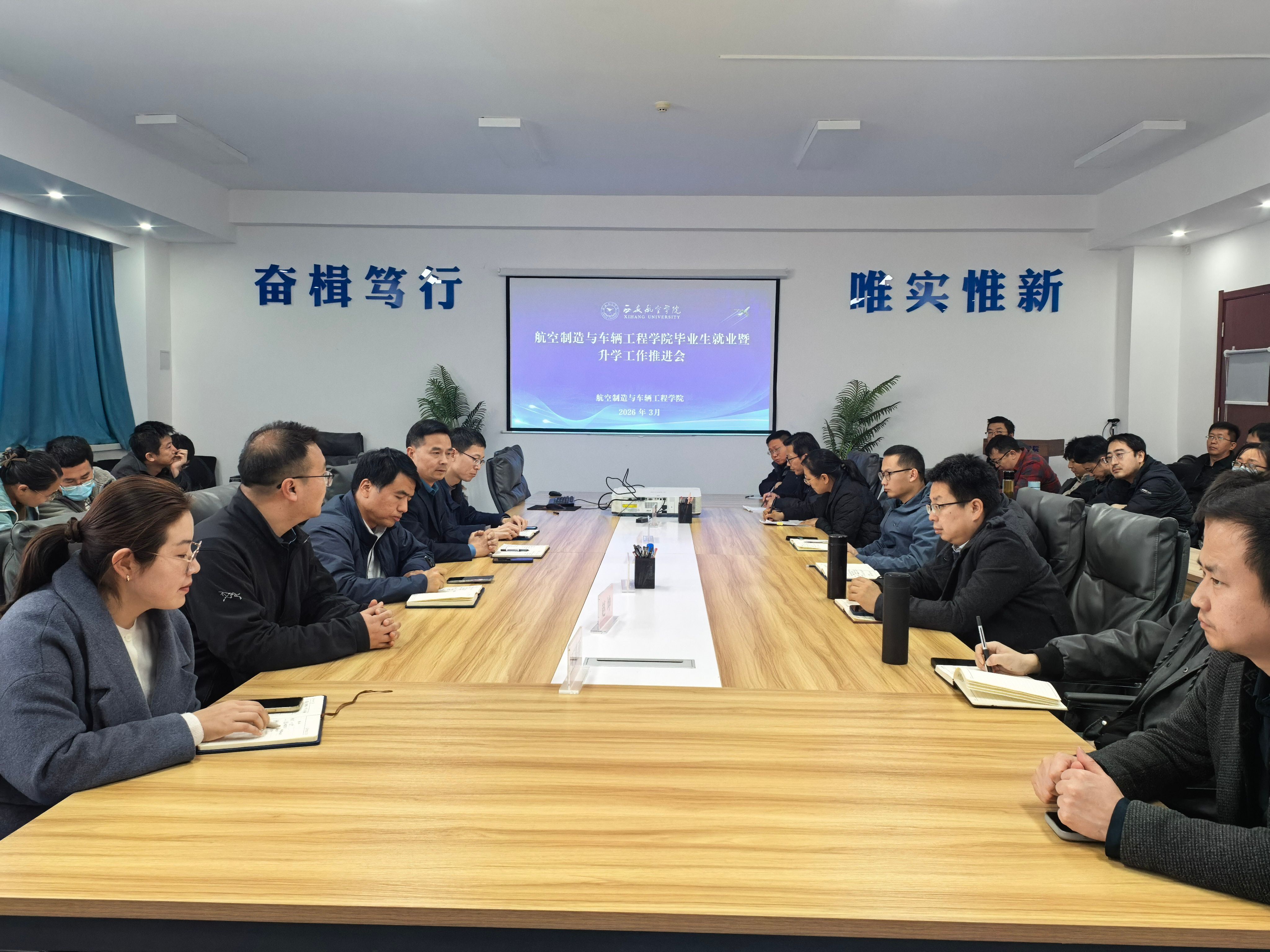 为进一步做好2026届毕业生就业与升学指导工作,切实提升人才培养质量,3月20日14时,航空制造与车辆工程学院召开毕业生就业暨升学工作推进会。学院党委书记吕毅、院长王永锋、党委副书记刘欣、副院长赵坤、学工办主任王嘉雨、全体毕业设计指导教师及毕业班辅导员参加会议。会议由学院党委副书记刘欣主持。